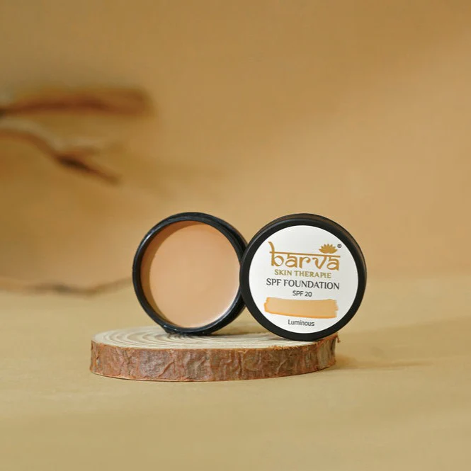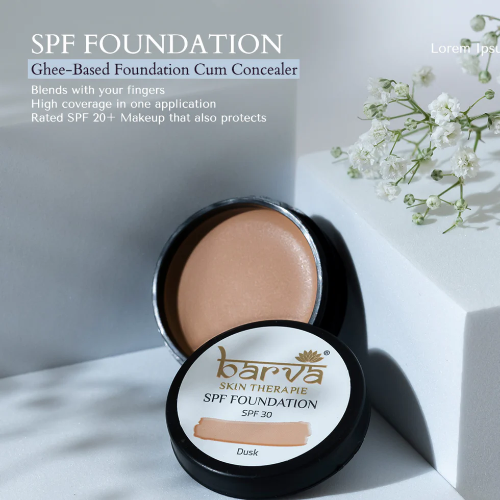 The SPF Cream Foundation/concealer for face by Barva Skin Therapie contains Cow Ghee (clarified butter) & Kokam butter (Garcinia indica). These ingredients rejuvenate the skin.