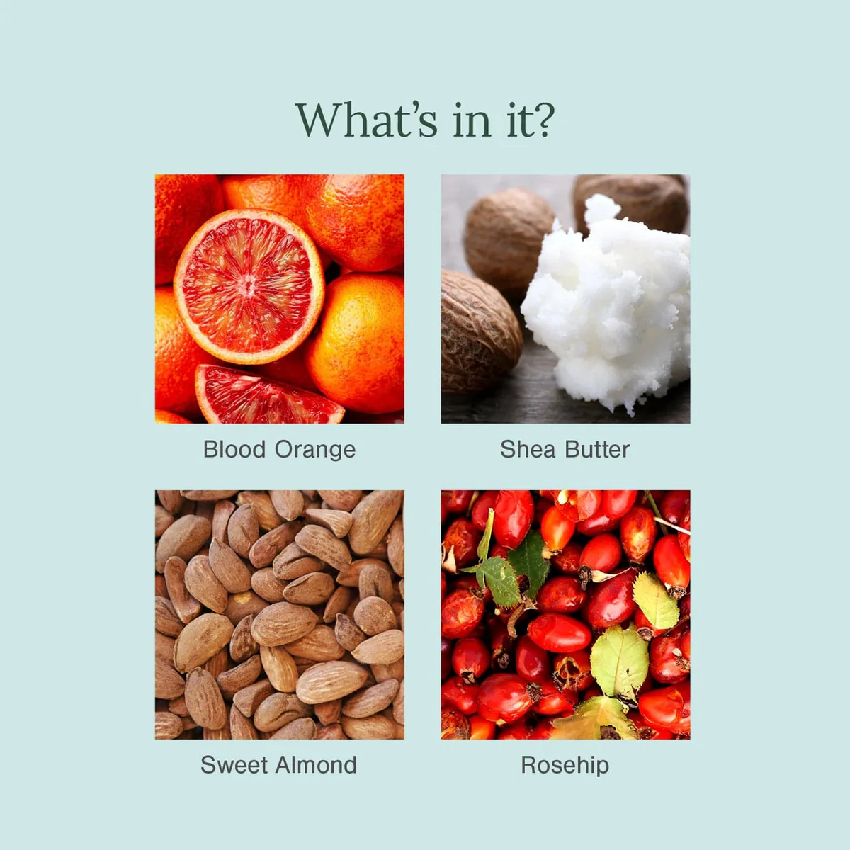 Sucrose (Sugar)*, Butyrospermum Parkii (Shea)Butter*, Prunus Amygdalus Dulcis (Sweet Almond) Oil*,Citrus Aurantium Dulcis (Blood Orange) Oil*, Cera Alba(Bees Wax)*, Rosa Canina (Rosehip) Oil*, Prunus Armeniaca(Apricot) Kernel Oil*, Tocopherol